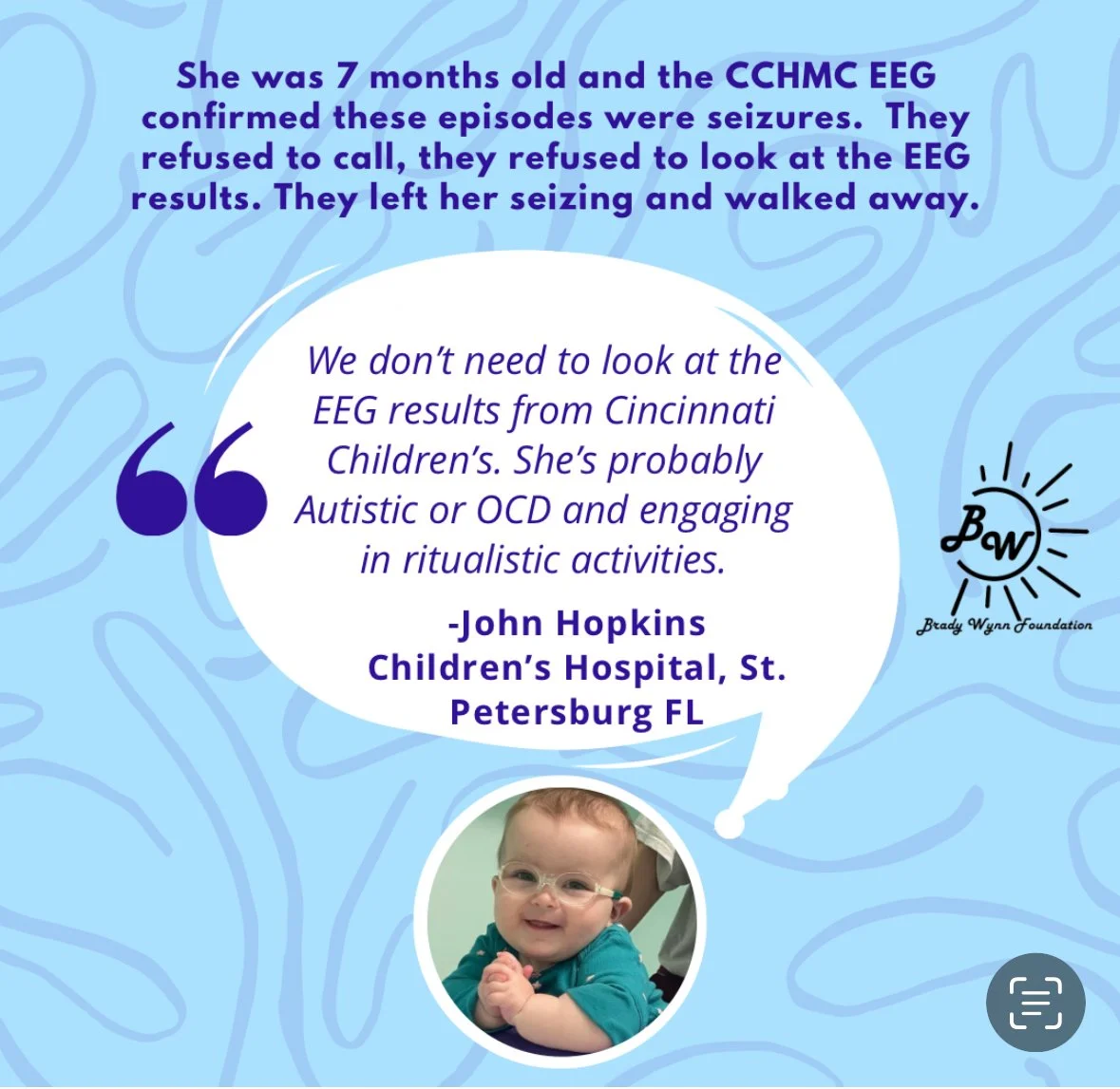 A doctor at John Hopkins Children’s hospital in St. Petersburg FL said “We don’t need to look at the EEG results from Cincinnati Childrens. She’s probably autistic or OCD and engaging in ritualistic activities.” This was said to parents of a precious 7-month-old after it was confirmed by a hospital that specializes in her disorder that she was having seizures. The doctor at John Hopkin’s left her seizing and walked away. Do better medical professionals.